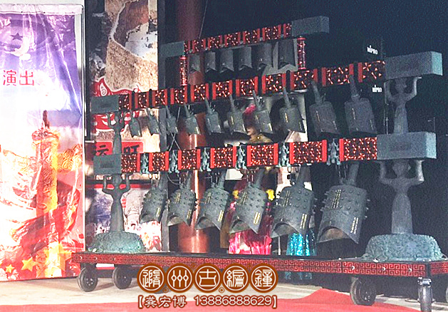編鐘全部為錫青銅鑄造而成,采用國(guó)際標(biāo)準(zhǔn)樂(lè)音音高A=440Hz調(diào)音,可以旋宮轉(zhuǎn)調(diào)演奏古今中外樂(lè)曲,編鐘大梁采用優(yōu)質(zhì)實(shí)木板制作,表面噴漆,彩繪花紋;另配有保管編鐘用的木箱,便于運(yùn)輸和儲(chǔ)存。編鐘底部可以安裝滑輪系統(tǒng),在舞臺(tái)上方便移動(dòng),2人配合可輕松迅速移動(dòng)到舞臺(tái)合適的位置。